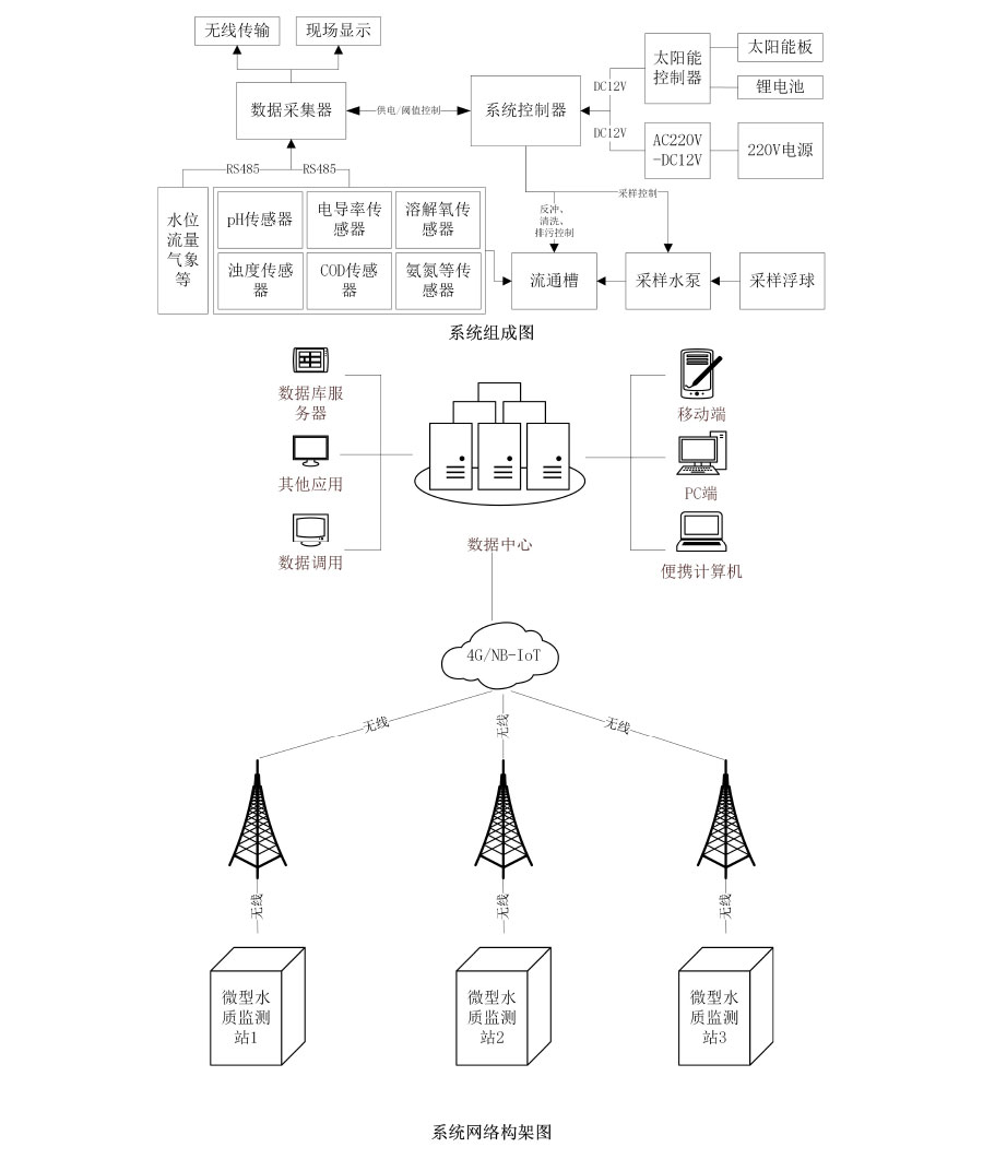 固定式微型水質(zhì)自動監(jiān)測站由前端采樣單元、水質(zhì)傳感器監(jiān)測單元、數(shù)據(jù)采集控制單元、數(shù)據(jù)傳輸單元,后端數(shù)據(jù)接收服務(wù)、環(huán)境監(jiān)測控制平臺及數(shù)據(jù)處理分析應(yīng)用功能組成。系統(tǒng)構(gòu)架圖如下: