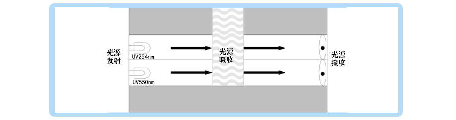 AN-WQSCOD型COD傳感器雙光路測量原理:含有共軛雙鍵或多環(huán)芳烴的有機物溶解在水中時,對紫外光有吸收作用。因此,通過測量這些有機物對254nm紫外光的吸收程度,以特別吸光系數(shù)SAC254來表達測量結果,作為衡量水中有機污染物總量的物理量。同時由于水中濁度對254nm紫外光有吸收作用進而影響測量結果,故采樣對有機物無吸收但對濁度有的550nm光進行補償消除濁度影響。