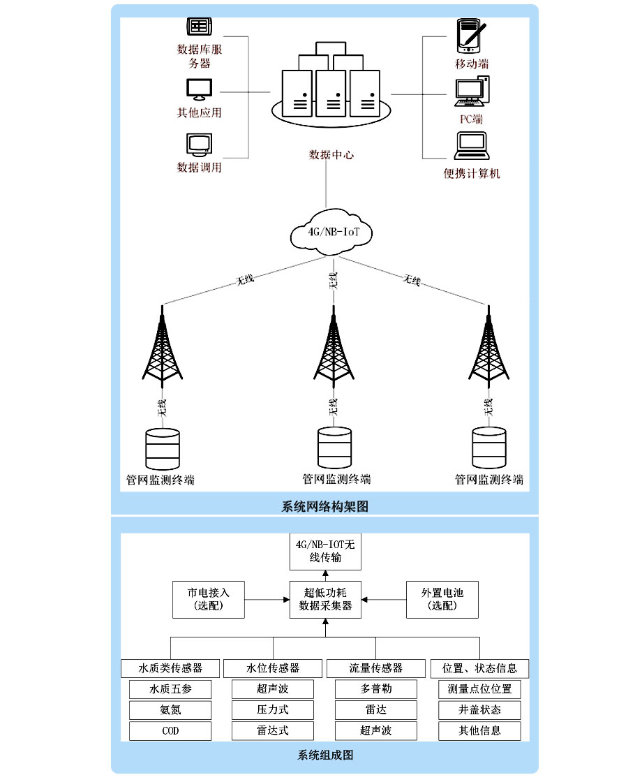 4G/NB-IoT等無線網絡通訊技術已經非常成熟,完全可以滿足本項目數據通訊的需要,所以信息采集與傳輸系統的通信網絡選擇4G/NB-IoT等無線網絡通訊的方式進行。